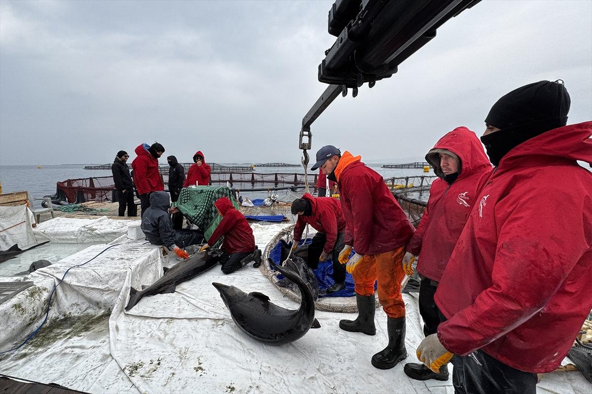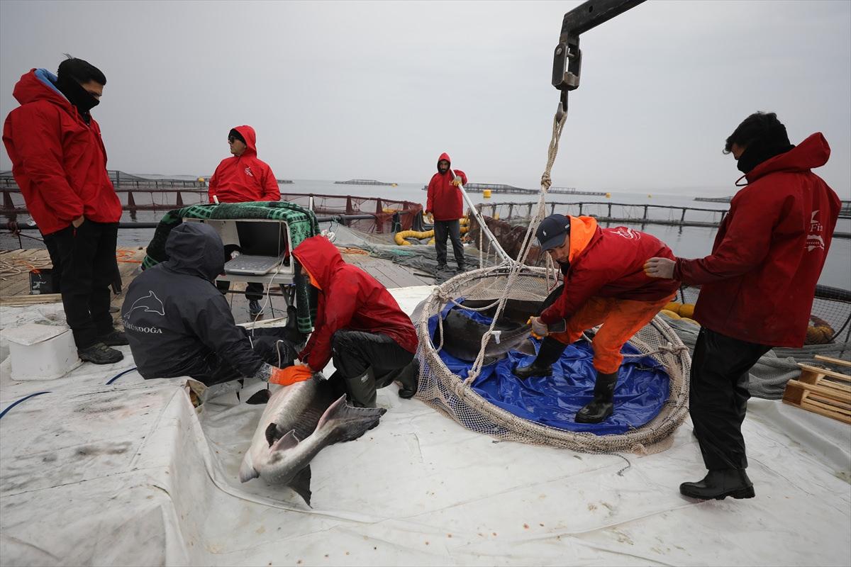 Ağ kafeslere alınan mersin balığının türleri 6 yaşına girdiklerinde ultrasonla cinsiyetleri belirlenerek dişi olanlar ayrı kafeslere alınıyor.