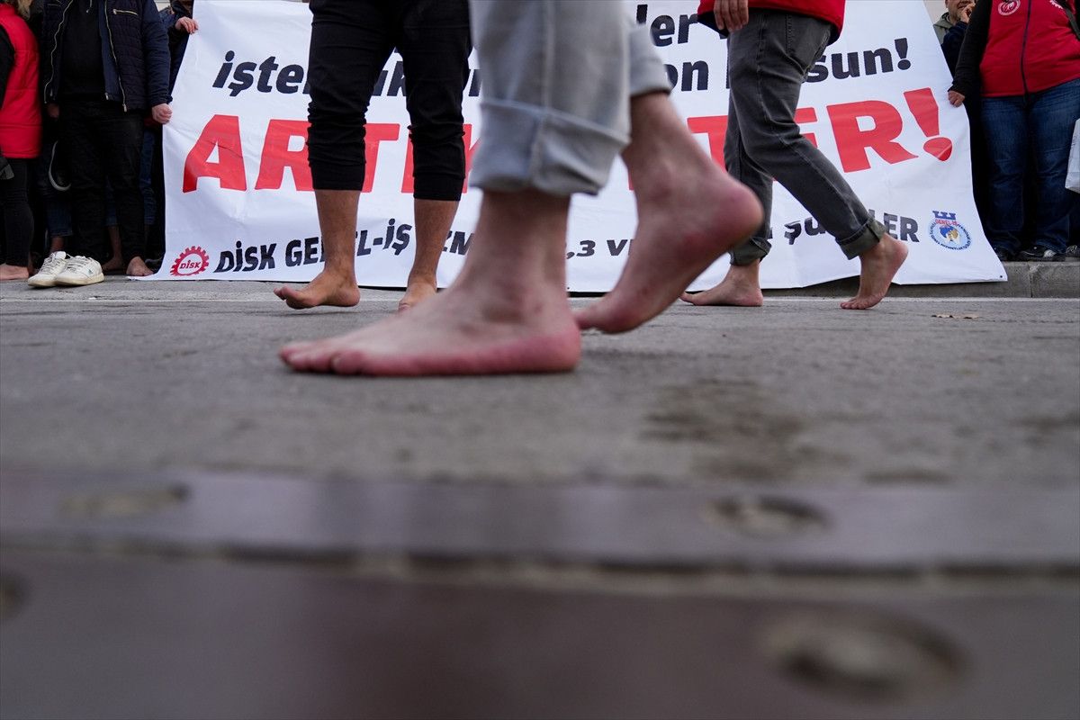 İşçiler ayakkabılarını ve çoraplarını çıkararak Mürselpaşa Bulvarı’ndan Kültürpark 9 Eylül Kapısı’na kadar yürüdü.