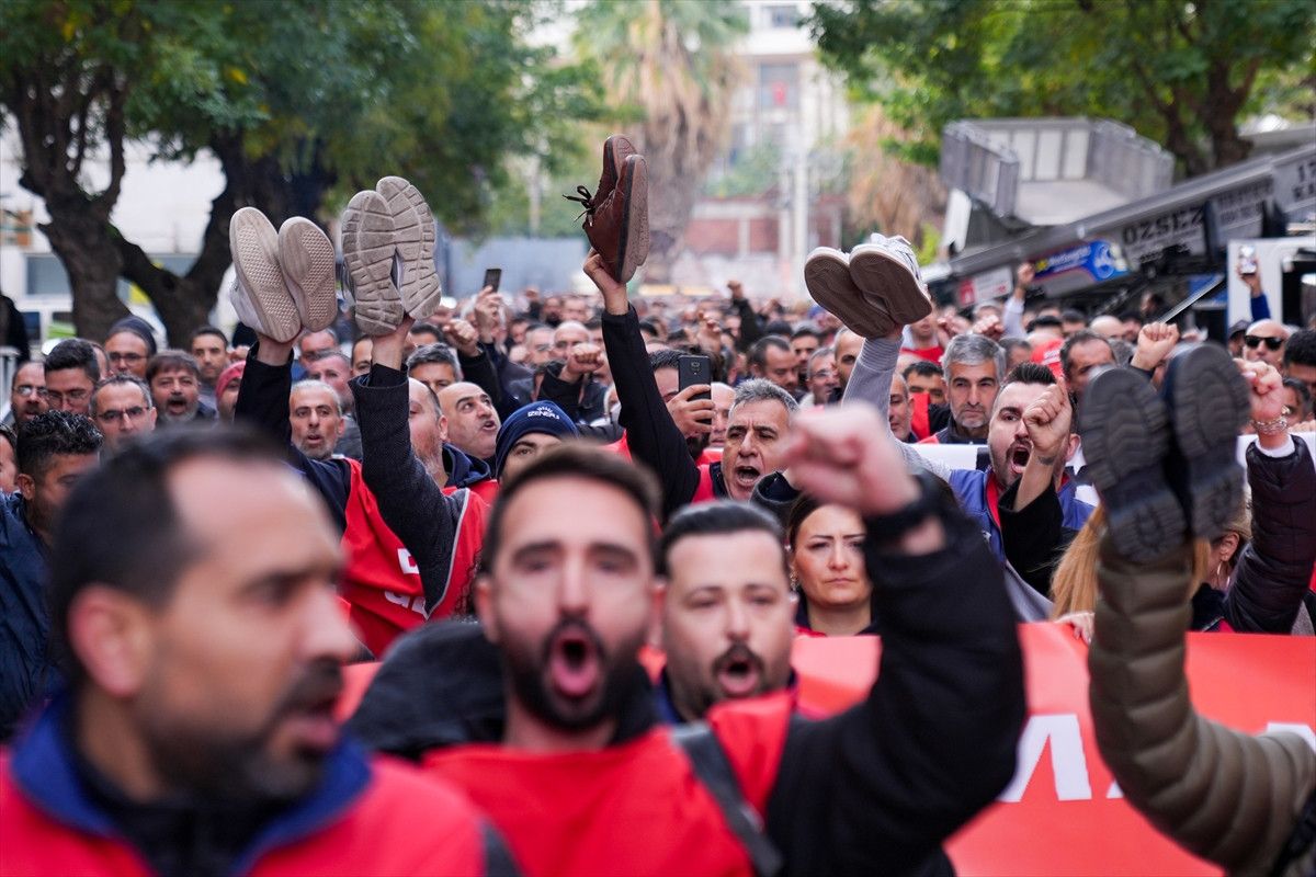 Yürüyüş sırasında slogan atan işçiler, ellerindeki ayakkabıları salladı.