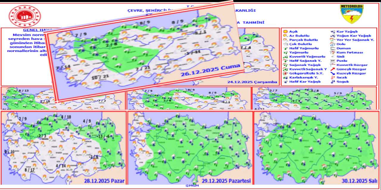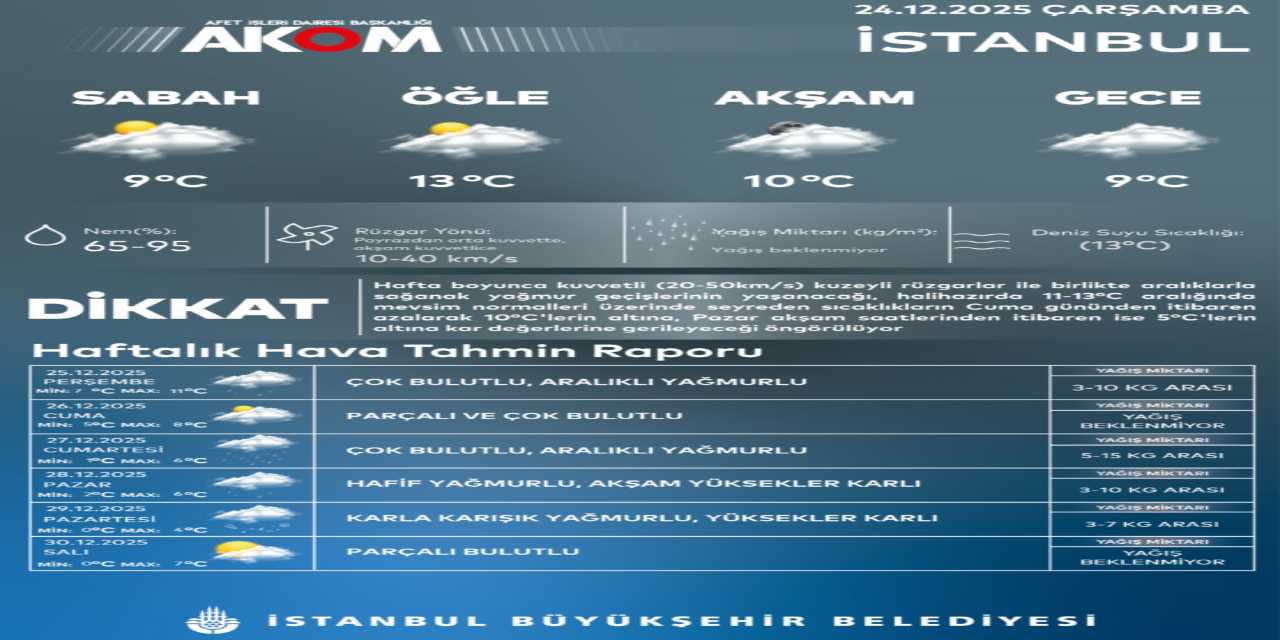 “Hafta boyunca kuvvetli (20-50km/s) kuzeyli rüzgarlar ile birlikte aralıklarla sağanak yağmur geçişlerinin yaşanacağı, halihazırda 11-13°C aralığında mevsim normalleri üzerinde seyreden sıcaklıkların Cuma gününden itibaren azalarak 10°C’lerin altına, Pazar akşam saatlerinden itibaren ise 5°C’lerin altına kar değerlerine gerileyeceği öngörülüyor.”