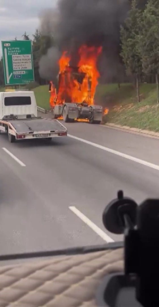 İstanbul Tuzla’da Anadolu Otoyolu Orhanlı Gişeler İstanbul istikametinde saat 16.10 sıralarında meydana gelen olayda, edinilen bilgilere göre Fatih A.(25) yönetimindeki 34 KEU 739 plakalı dorsesiz TIR, seyir halindeyken alev aldı.