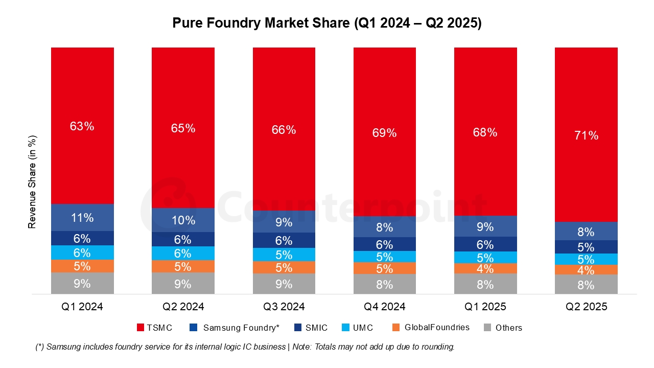 Şu anda TSMC, yarı iletken üretiminde en önde gelen tedarikçi konumunda. Apple, NVIDIA, AMD ve Qualcomm gibi tüm büyük teknoloji devleri, çip üretimini TSMC’ye yönlendiriyor. Özellikle yapay zeka çılgınlığı, TSMC’nin üretim hatlarının kullanım oranı ciddi şekilde arttı. Counterpoint araştırma şirketine göre TSMC’nin dökümhane pazar payı önceki çeyreğe kıyasla %3 artarak %71 seviyesine ulaştı.