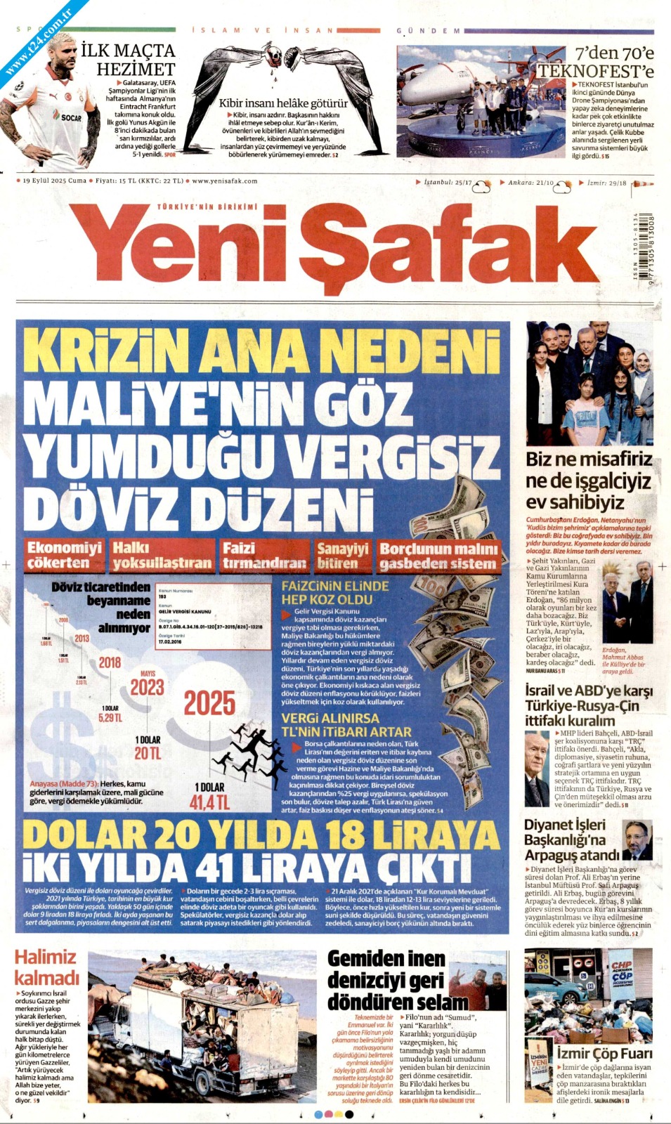 Yeni Şafak’ın manşetten verdiği “Krizin ana nedeni Maliye’nin göz yumduğu vergisiz döviz düzeni” haberinde, “Gelir Vergisi Kanunu 75, 80, 82. maddeleri kapsamında döviz kazançlarının vergiye tabi olması gerekirken, Maliye Bakanlığı bu hükümlere rağmen bireylerin yüklü miktardaki döviz kazançlarından vergi almıyor. Yıllardır süren vergisiz döviz düzeni, Türkiye’nin son yıllarda yaşadığı ekonomik çalkantıların ana nedeni olarak öne çıkıyor. Ekonomiyi kıskaca alan vergisiz döviz düzeni enflasyonu körüklüyor, faizleri yükseltmek için koz olarak kullanılıyor” denildi.