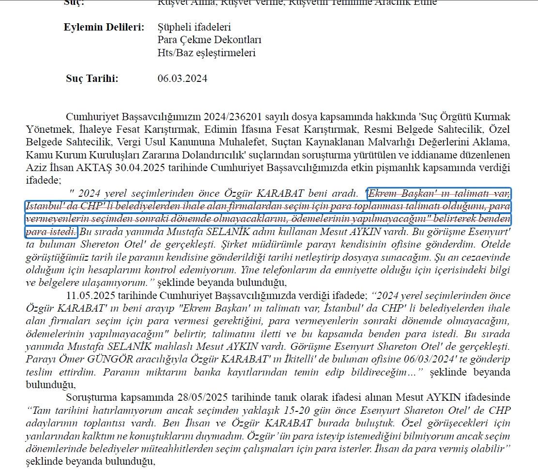 “2024 yerel seçimlerinden önce Özgür Karabat beni aradı. ‘Ekrem Başkan’ın talimatı var, İstanbul’da CHP’li belediyelerden ihale alan firmalardan seçim için para toplanması talimatı olduğunu, para vermeyenlerin seçimden sonraki dönemde olmayacaklarını, ödemelerinin yapılmayacağını’ belirterek benden para istedi.”