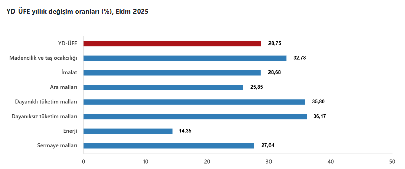 Türkiye İstatistik Kurumu ekim ayı Yurt Dışı Üretici Fiyat Endeksi (YD-ÜFE) rakamlarını açıkladı. Buna göre YD-ÜFE 2025 yılı Ekim ayında bir önceki aya göre yüzde 0,90 artış, bir önceki yılın Aralık ayına göre yüzde 28,69 artış, bir önceki yılın aynı ayına göre yüzde 28,75 artış ve on iki aylık ortalamalara göre yüzde 25,13 artış gösterdi.